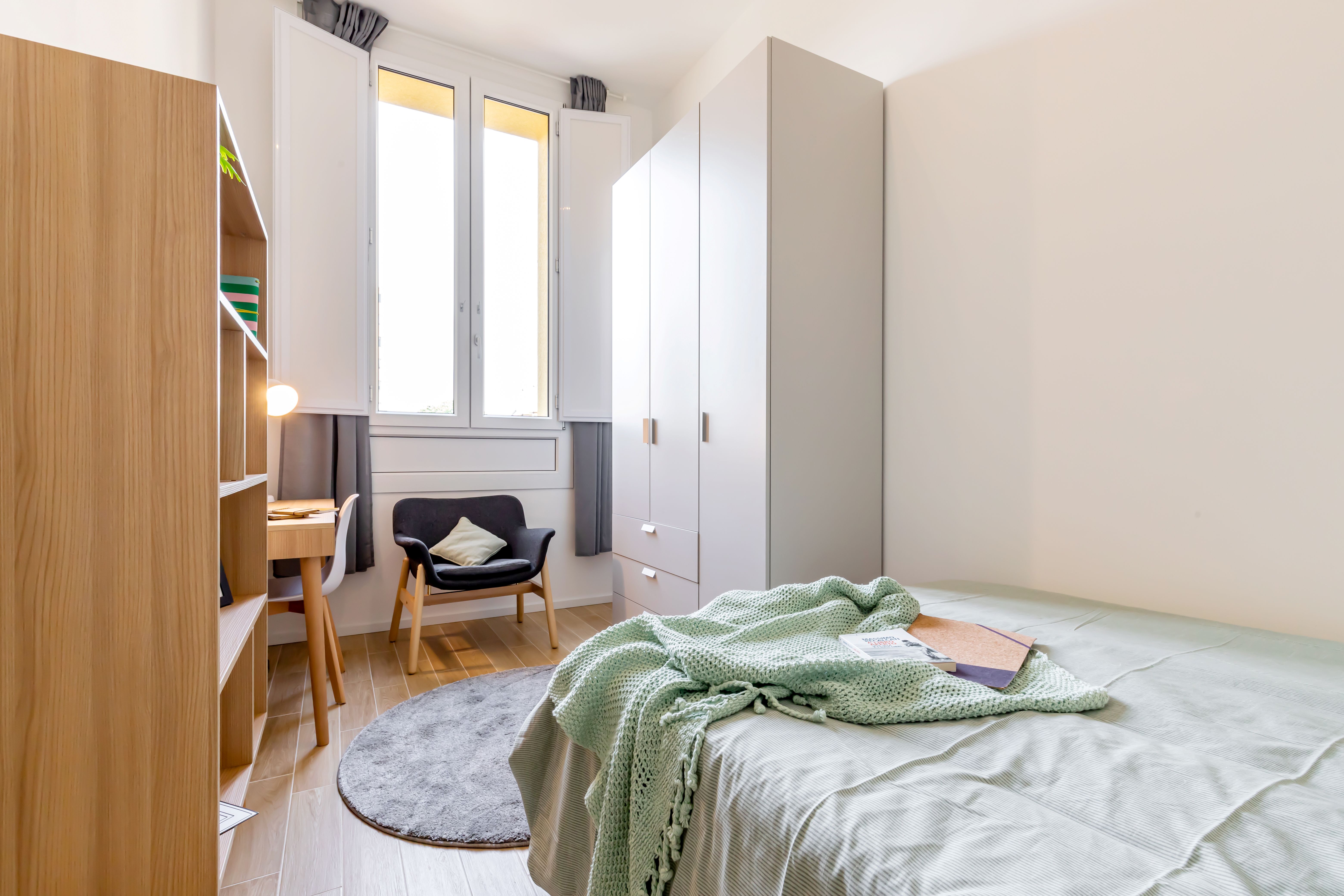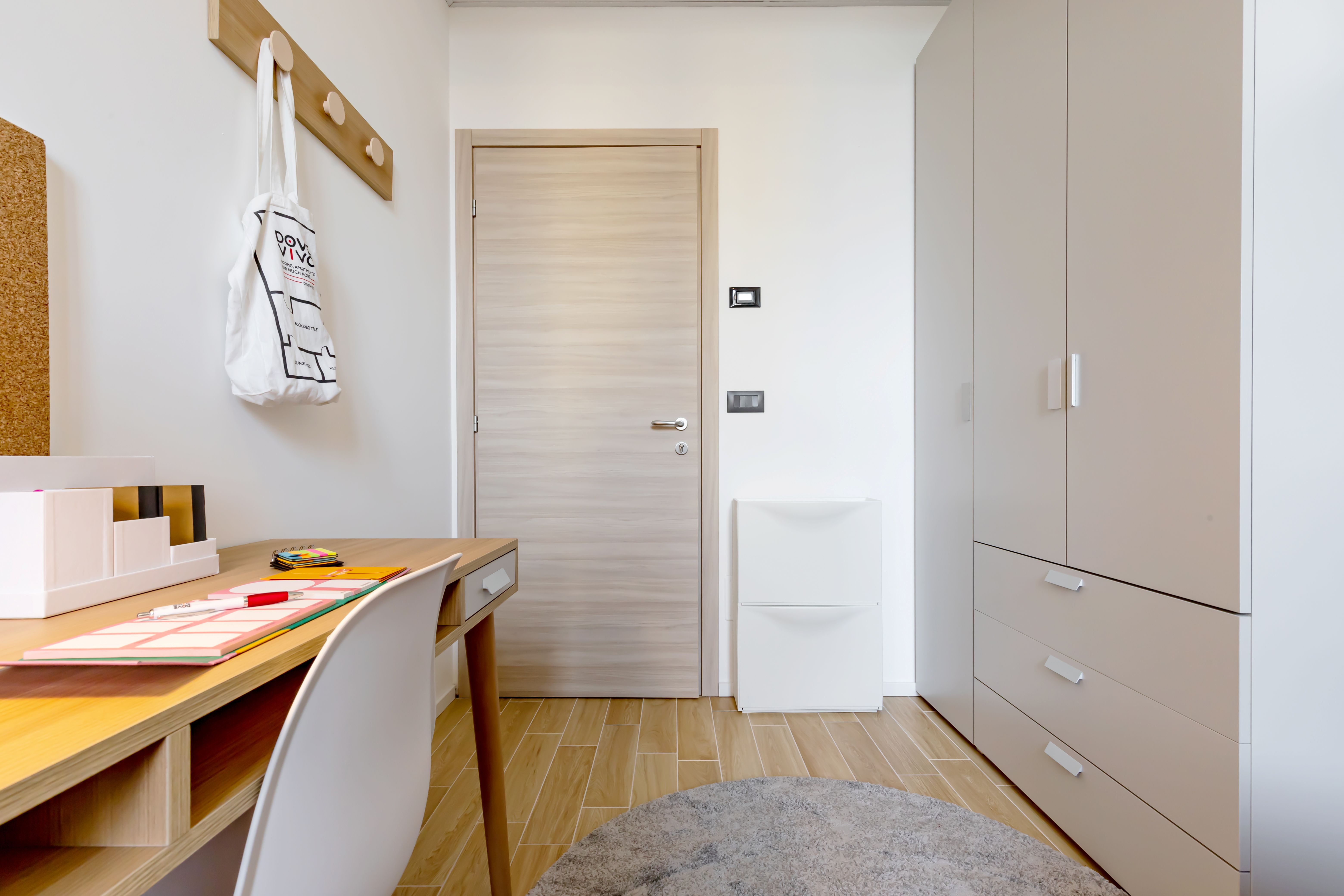 La zona notte è composta da letto matrimoniale e armadio adatto ad accogliere tutti gli effetti personali dell'inquilino, la stanza è dotata inoltre di uno scrittoio e di una boiserie poggia valigia, oltre che di una televisione.