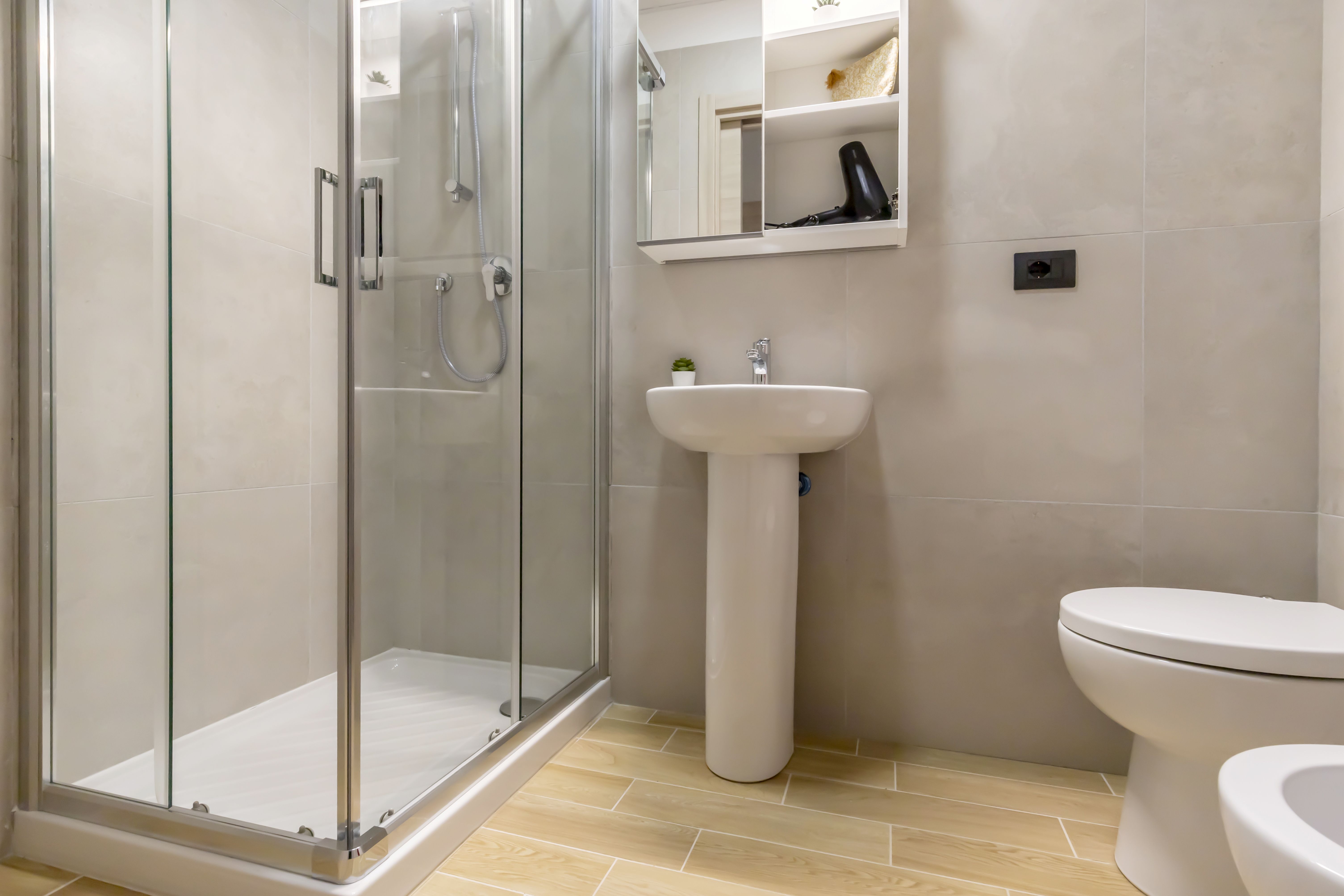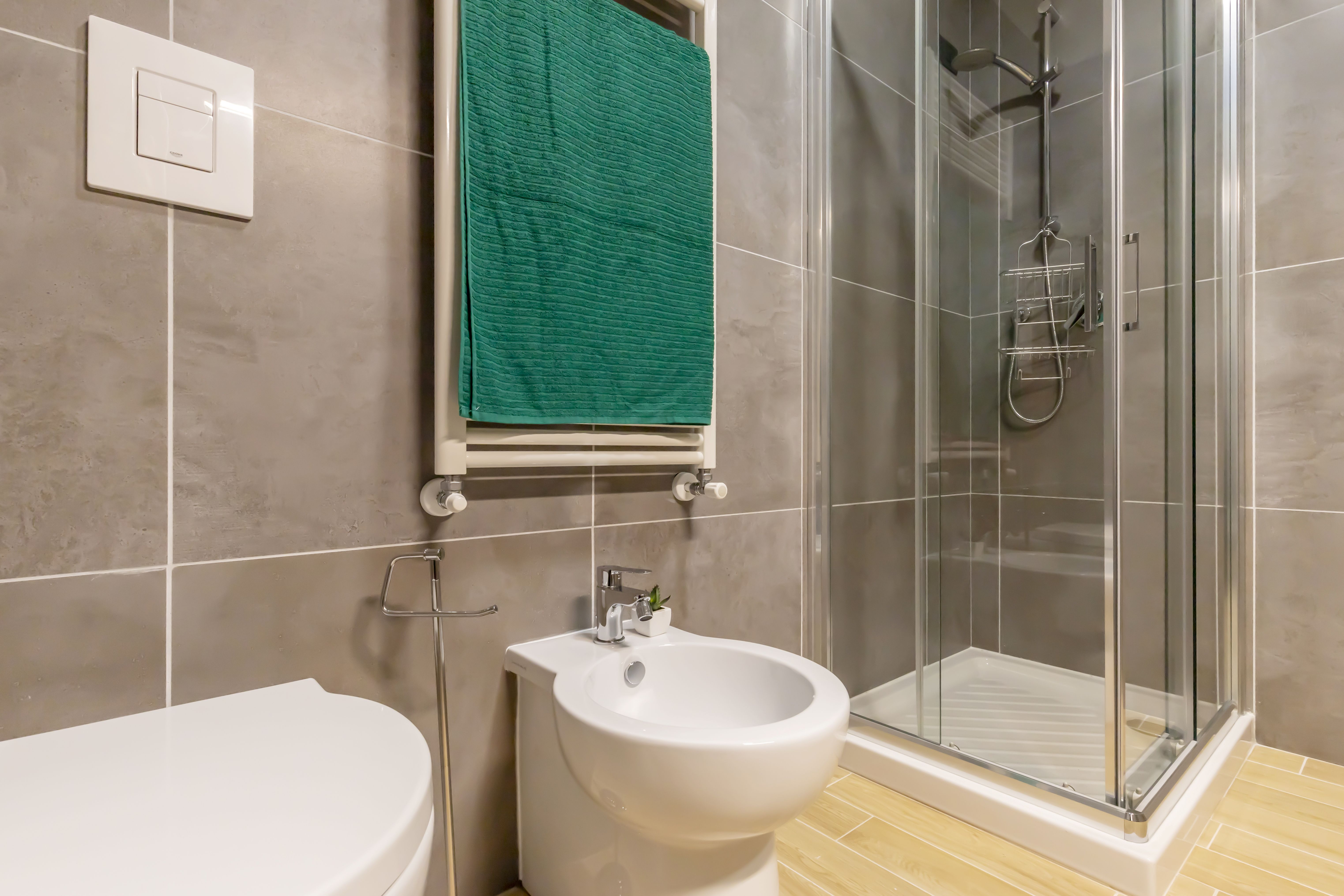 Sanitari filomuro a terra per una maggiore pulizia e rubinetteria cromata, rendono il bagno un ambiente confortevole e funzionale. Completano l'ambiente i colori neutri delle piastrelle su pareti e pavimento.