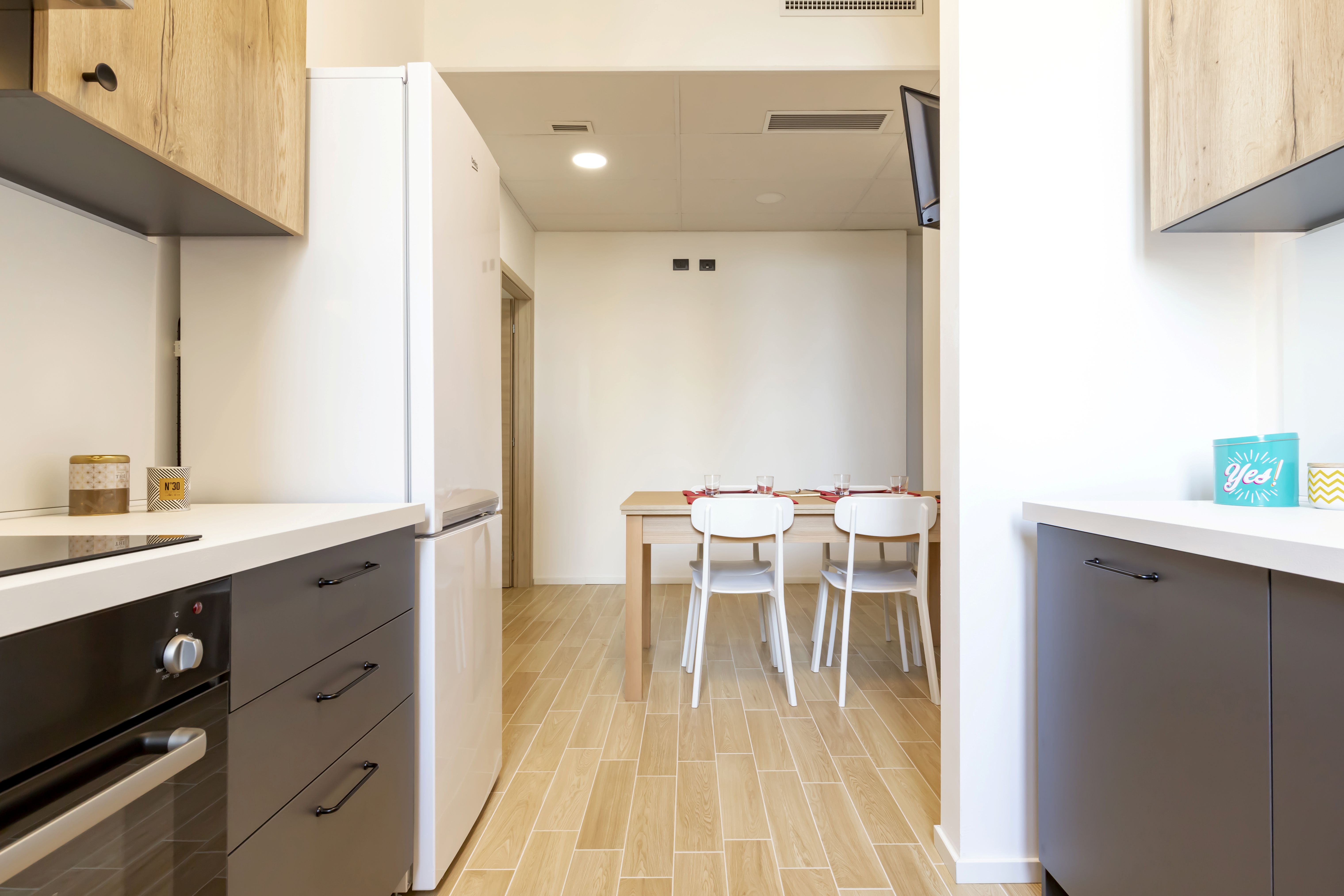 La zona cucina è composta da soluzioni semplici, pratiche ed eleganti. I materiali sono studiati per contrastare l'usura quotidiana. Si compone di tutti gli elettrodomestici necessari (forno a microonde, lavastoviglie) per rispondere a tutte le esigenze, coadiuvando funzionalità ed estetica.