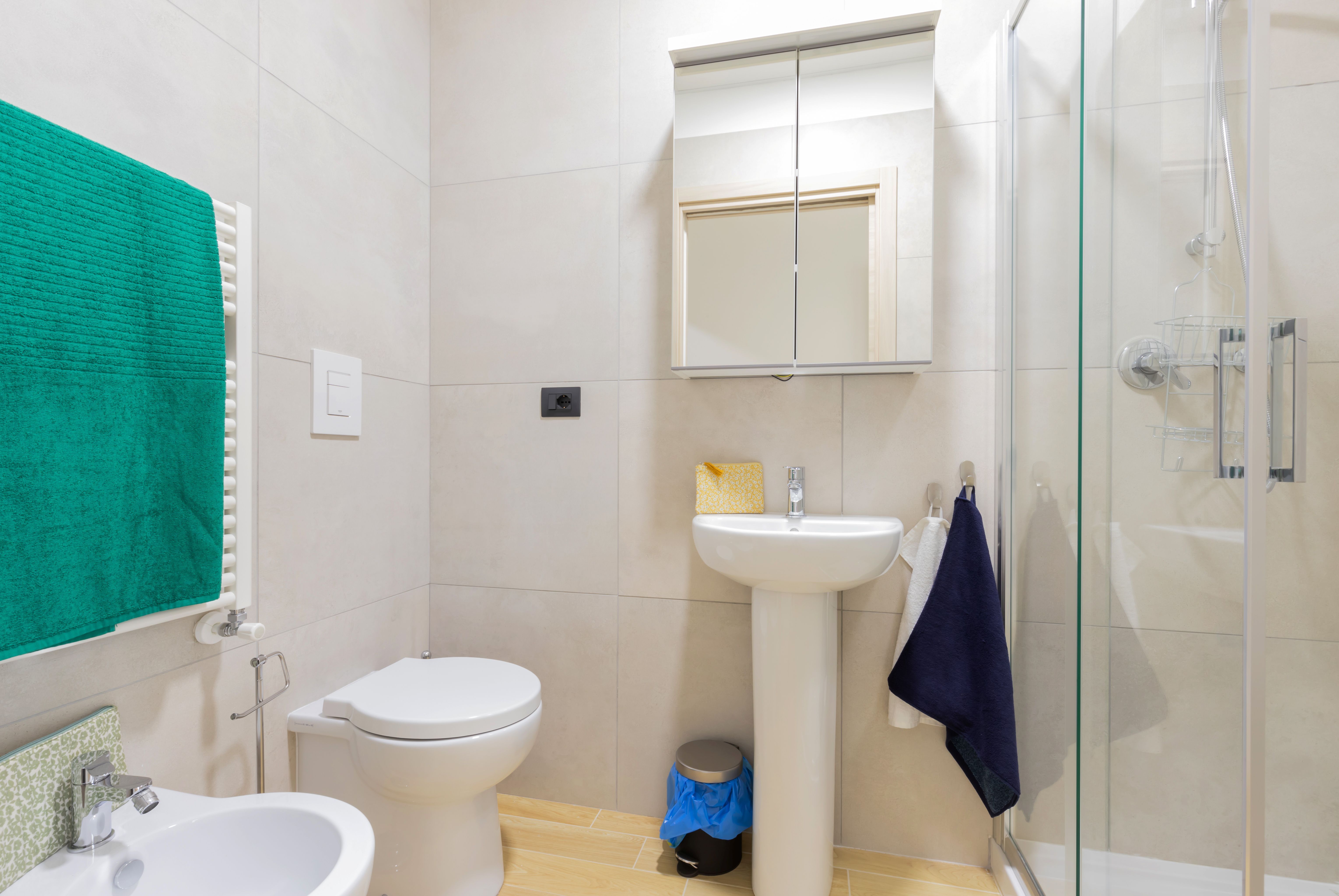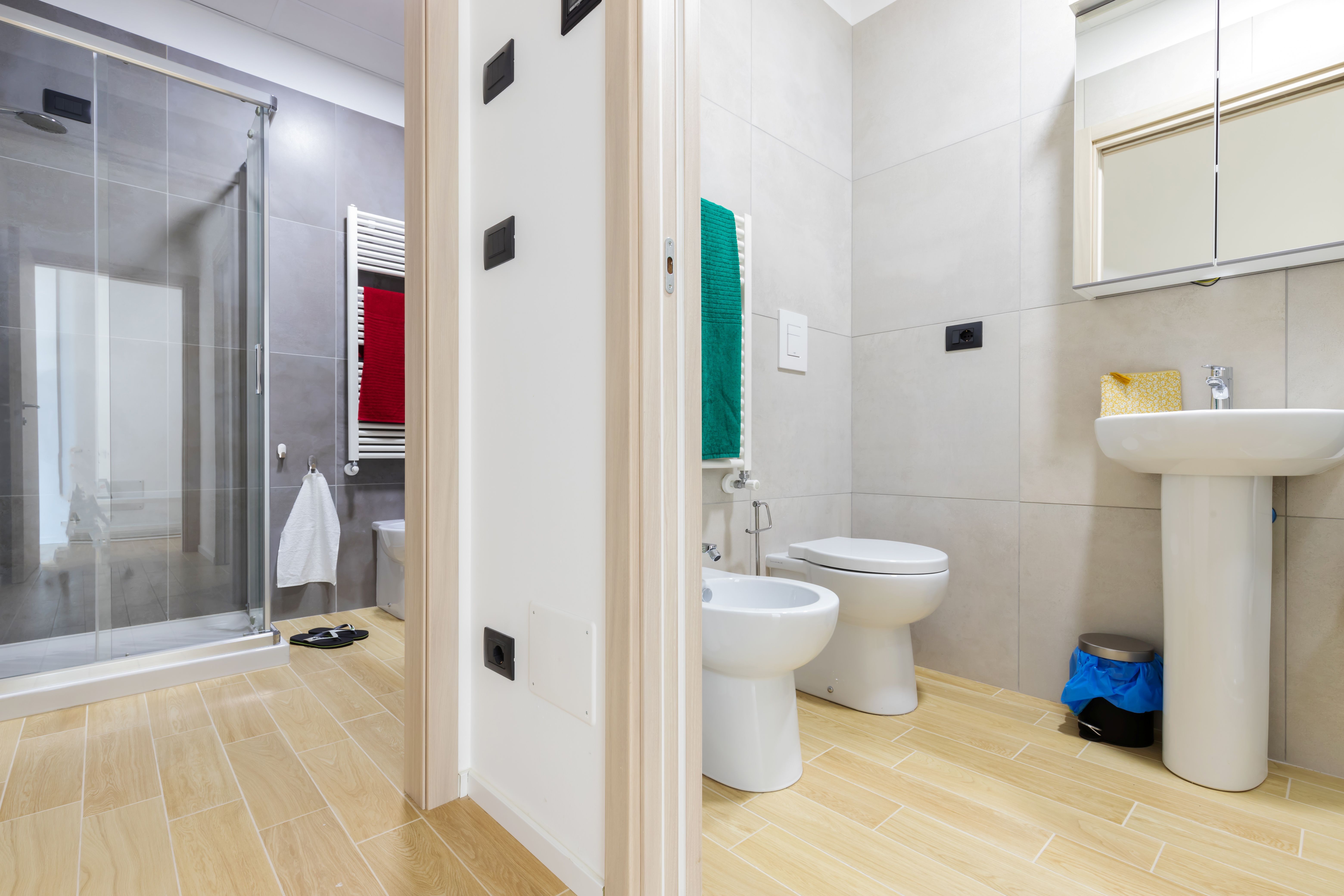 Sanitari filomuro a terra per una maggiore pulizia e rubinetteria cromata, rendono il bagno un ambiente confortevole e funzionale. Completano l'ambiente i colori neutri delle piastrelle su pareti e pavimento.